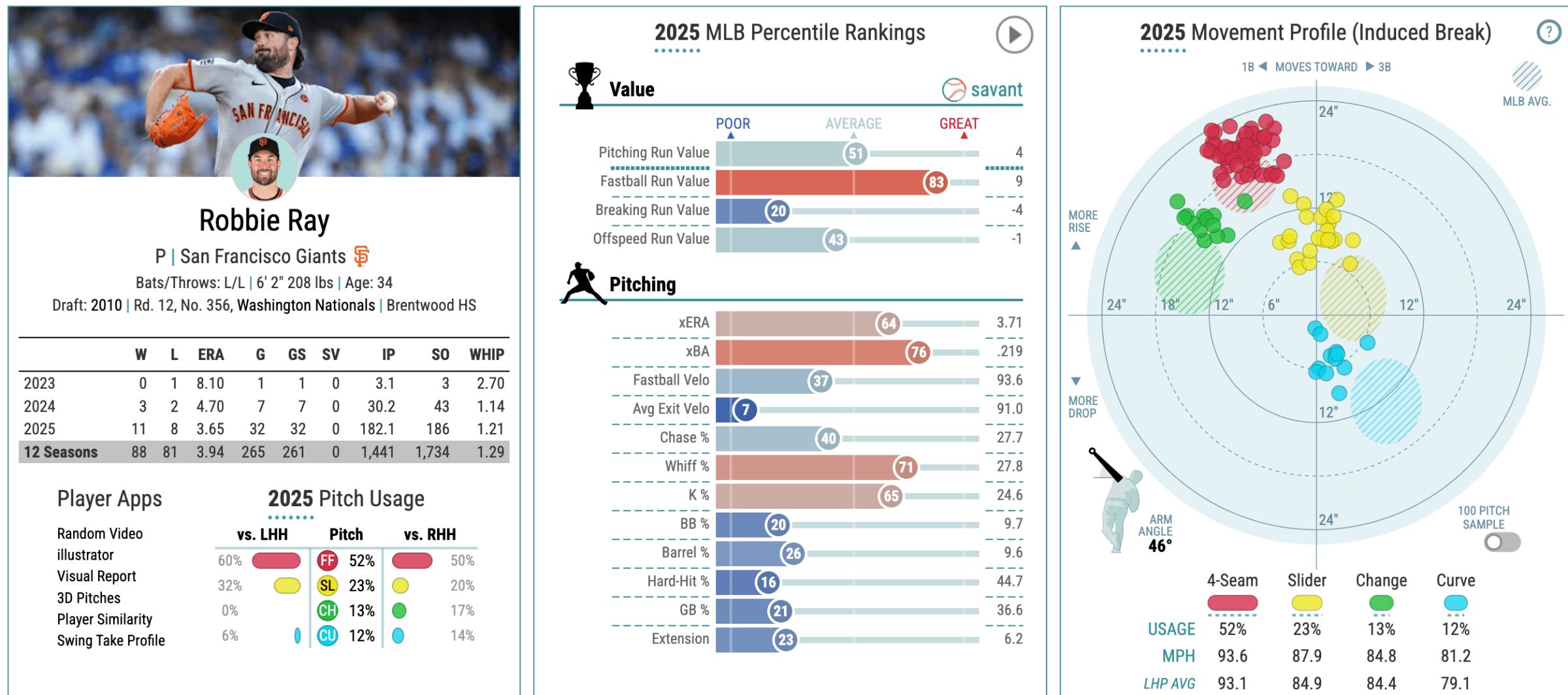 The invitation to the Midsummer Classic was well-deserved. His last two seasons for Seattle and San Francisco were cut short by Tommy John surgery then long delayed by recovery. But at the start of the 2025 season, Ray was finally healthy and pitched with purpose from the jump. The relief he felt being back on the mound with regularity was clear, his loud grunts of gratitude echoed throughout the stadiums as he won his first three outings of the year. From the end of April to the beginning of June, the southpaw strung together eight consecutive quality starts. His strong performance had Fangraphs’ blogger Ben Clemens singing his praises, marveling at Ray’s ability to do so much with so little. Just a mid-to-low 90s four-seamer, three subpar secondary pitches, and a whole lot of backspin was ostensibly all he needed to not only be effective, but reclaim his Cy Young form from 2021. Out of nowhere, he flirted with a “Maddux” in Arizona, throwing his second career complete game. He then tangoed with future World Series MVP Yoshinobu Yamamoto right before the break, logging his 13th quality start in 20 games.