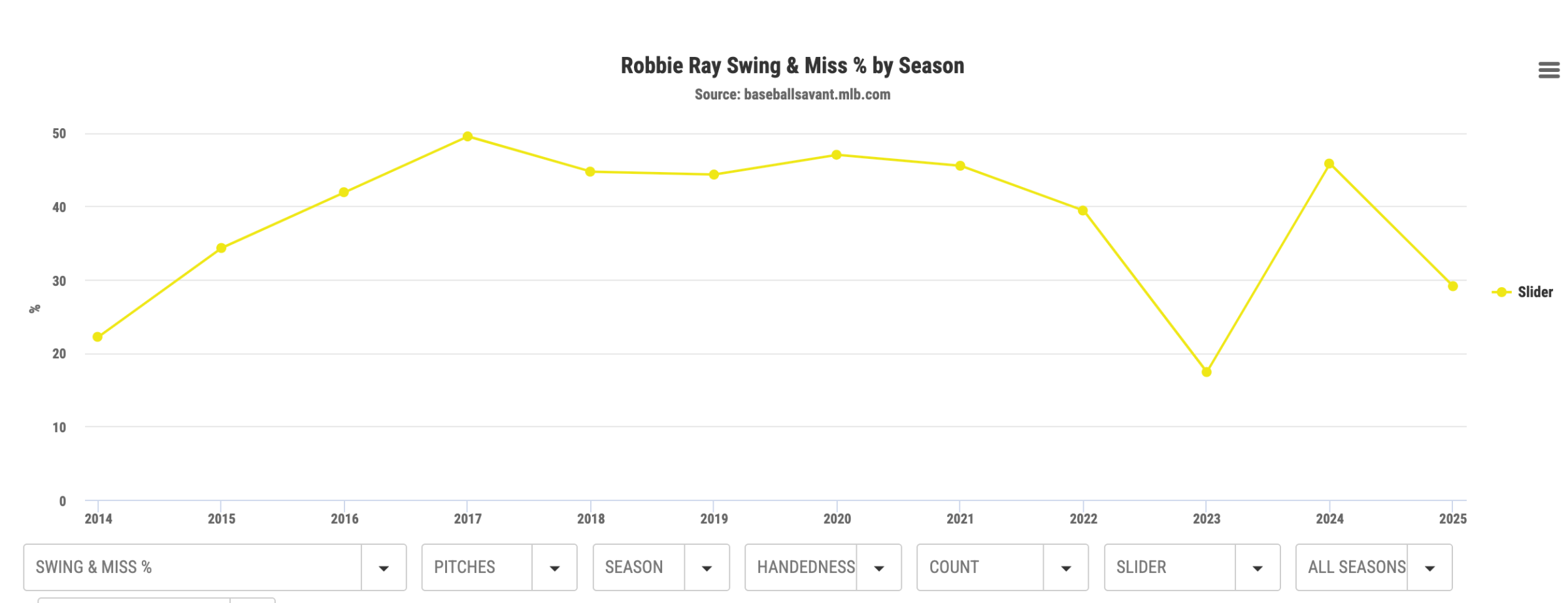 As you can see, in 2025, the slider’s whiff-% came in at 29% — Ray’s lowest mark ever in a full season of work.