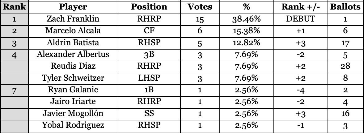 For just the fourth time, a player has topped the ballot in his first try, and technically No. 1 overall voted prospect Braden Montgomery sorta doesn’t count. But this round, Zach Franklin has joined Mathias LaCombe and Ky Bush as first-timers and Vote winners all in one sweep. Franklin romped in sparse voting, with 15 of 39 (38%) votes: