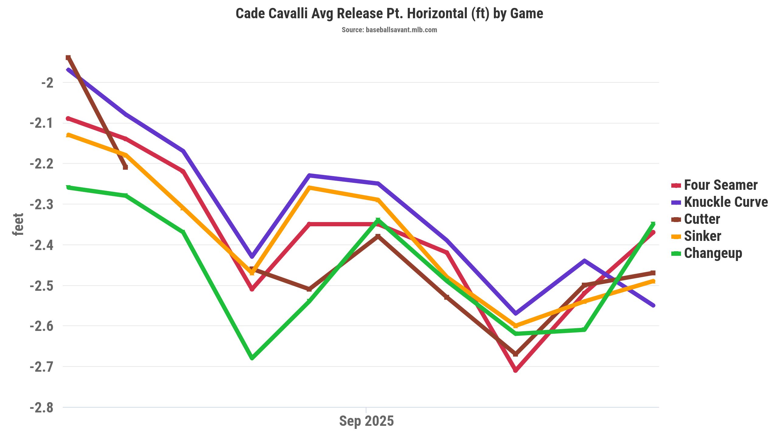 He was throwing from a higher arm angle (43.9 degrees), by over six degrees in 2025, primarily due to his horizontal release point shifting over five inches farther from his midline and adding nearly five inches (4.8) of extension. Interestingly, Cavalli’s horizontal release point was almost six inches different (farther) at majors (28.3 inches) than what we saw in Triple-A (22.8 inches) in 2025.