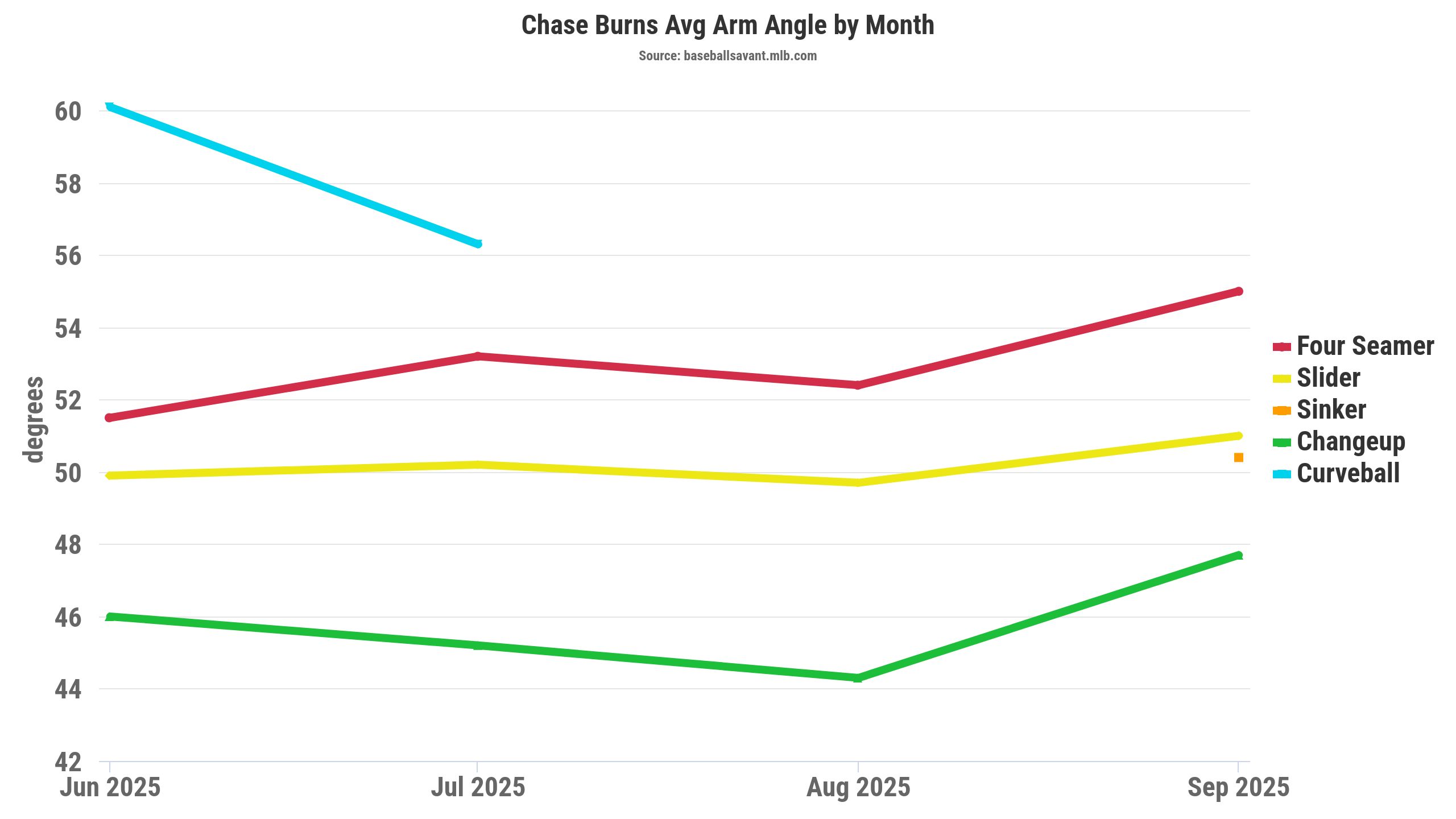 Interestingly, Burns’s arm angle rose in the final months after returning from the elbow injury, though it could be a noisy small sample. Theoretically, those arm angle changes would impact his pitch movement profiles.