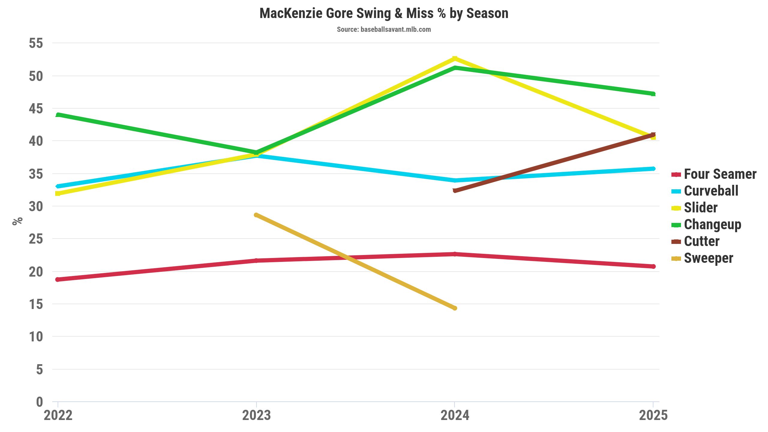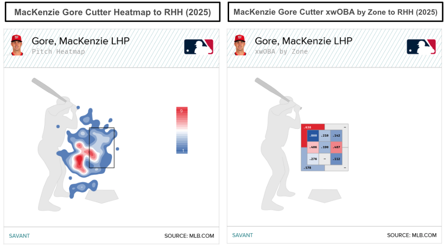 The data support the cutter heatmaps against right-handed hitters, with a 36.8 percent zone rate. It’s an interesting wrinkle in Gore’s arsenal, because before 2024, he threw the slider more often, though it could be a pitch classification issue. Over the past two seasons, Gore’s cutter has elicited whiffs and induced weak contact.