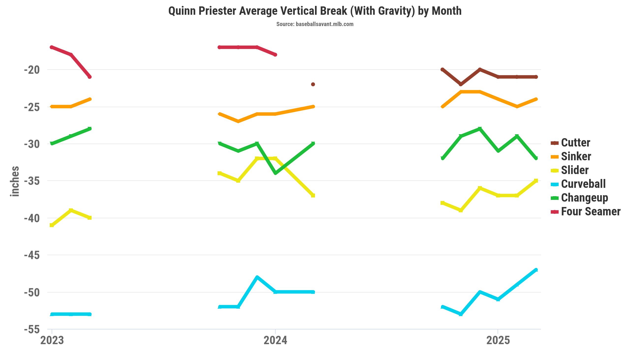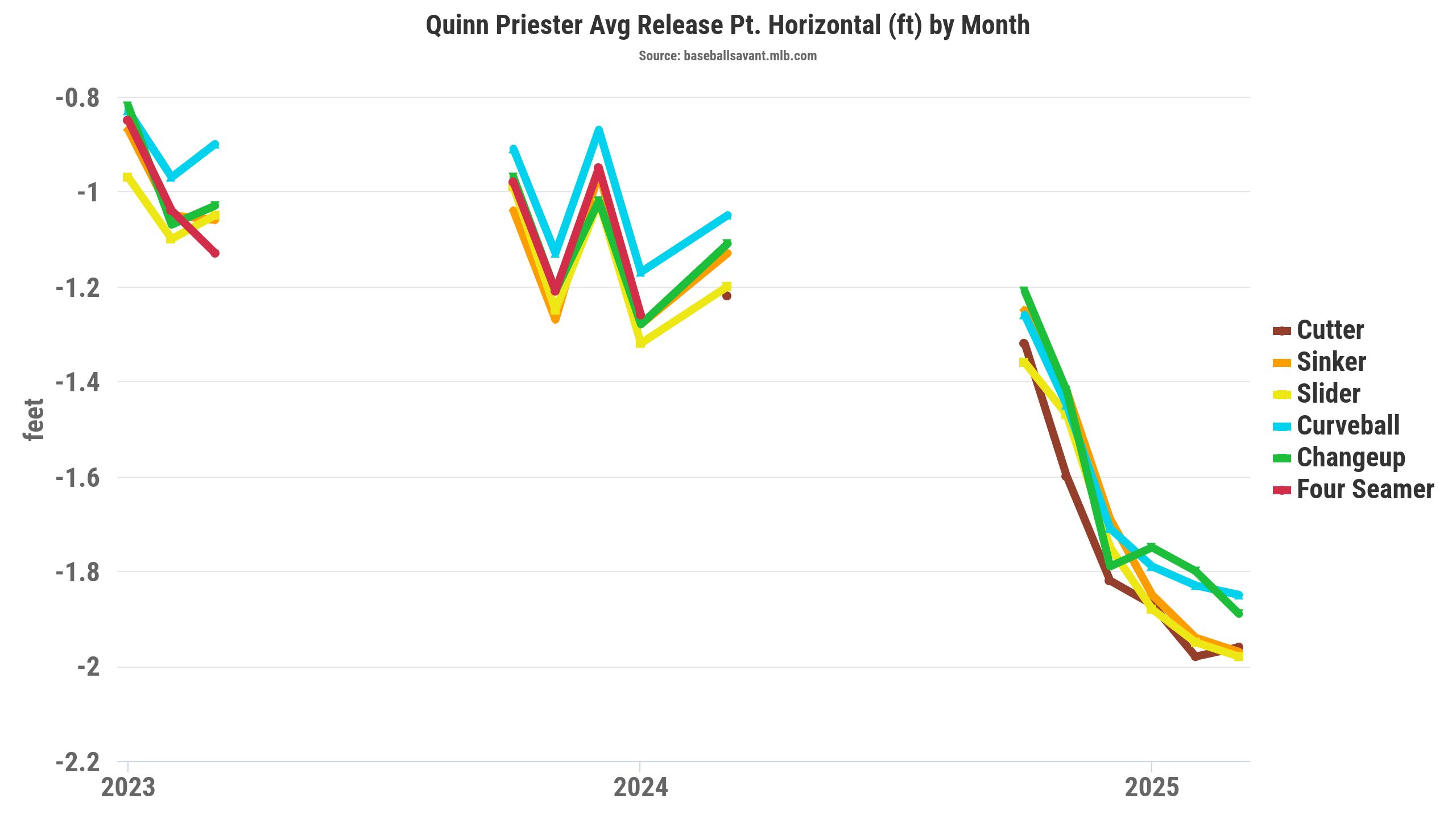 Priester popped up in my pitcher filters as someone who raised their arm angle to 46.9 degrees in 2025, after being at 42.6 degrees in 2024. It was a noteworthy arm angle chance because Priester shifted his horizontal release point significantly farther away from his midline by over six inches (6.7), compared to 2024. Priester’s horizontal release point adjustment aligned with minor and major pitch movement profile changes.