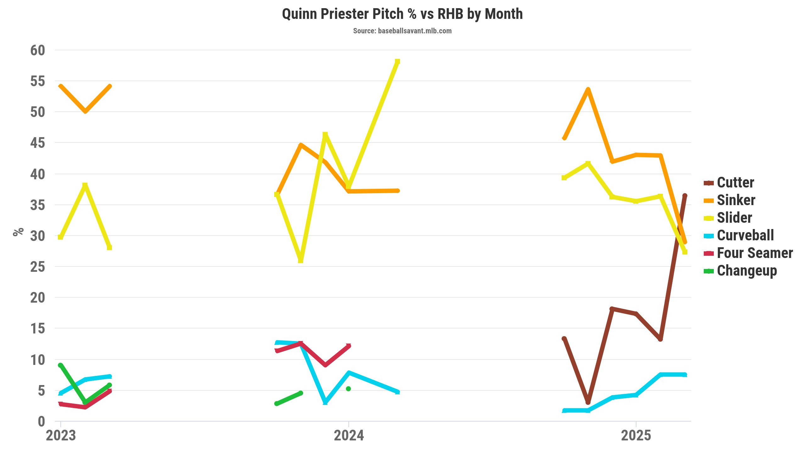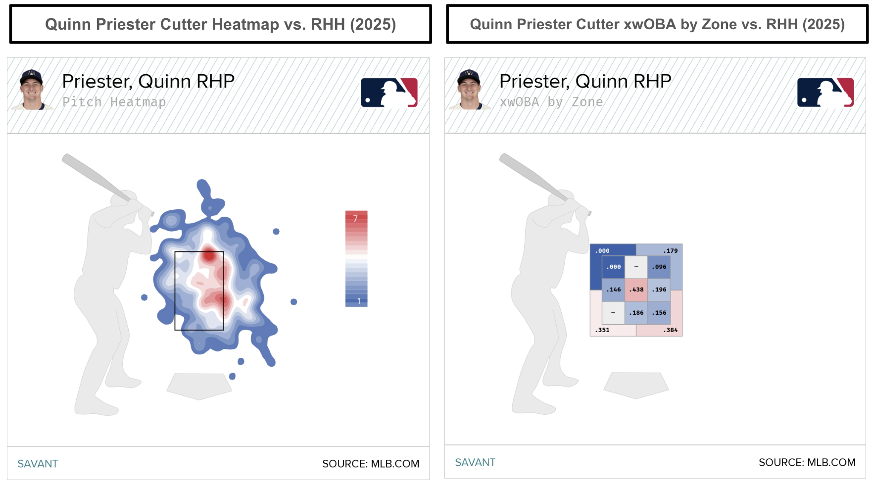 Since Priester lacks a dominant four-seamer, he added a cutter that he throws 24.1 percent of the time to left-handed hitters. Meanwhile, Priester throws the cutter 17.4 percent of the time, finding success (.241 wOBA, .234 xwOBA) against right-handed hitters. That’s been a significant bump in cutter usage while locating the pitch away from righties.