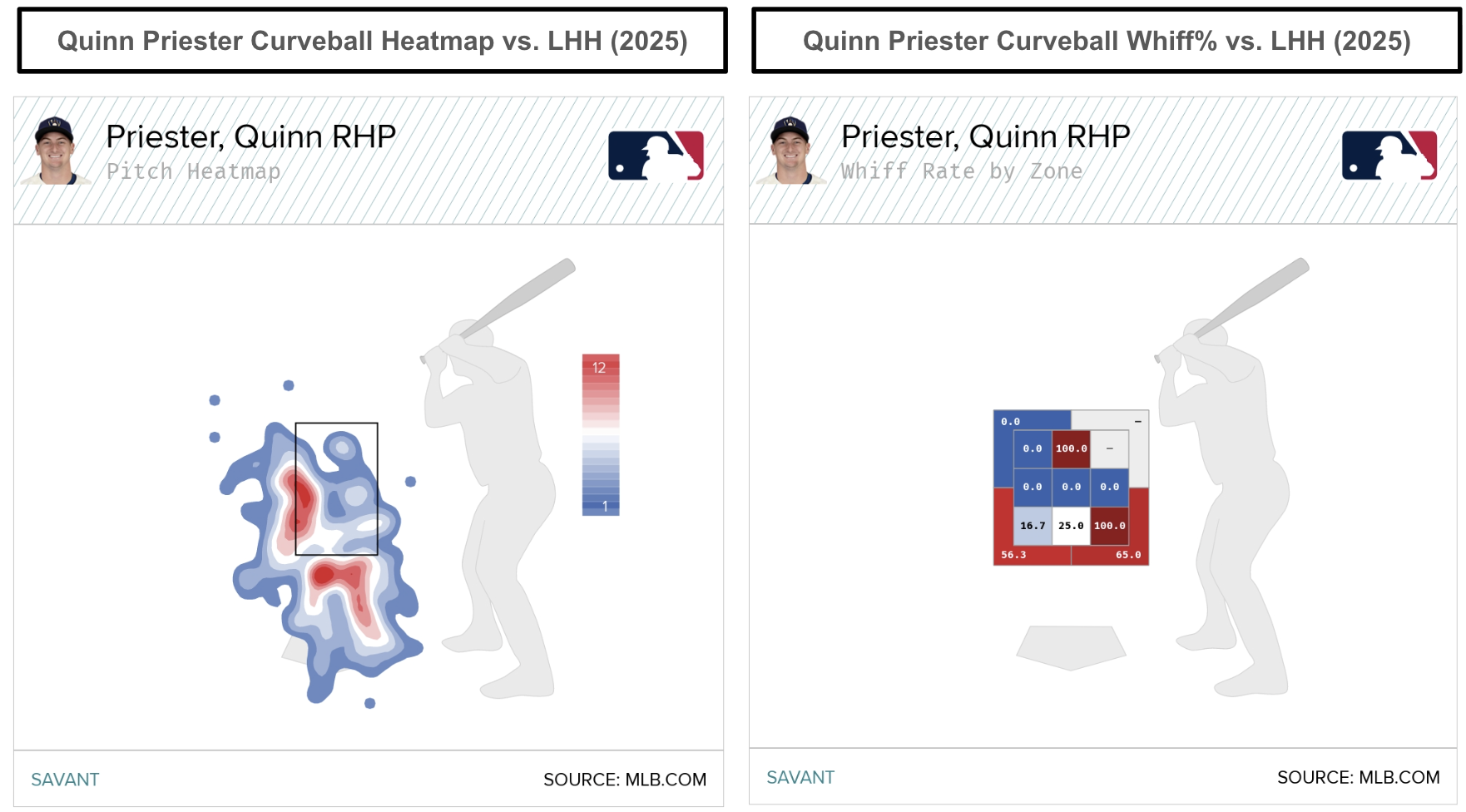 The sinker generates a 64.8 percent ground-ball rate while being slightly better against righties (.321 wOBA, .314 xwOBA) than lefties (.320 wOBA, .341 xwOBA). Interestingly, Priester’s curveball led his arsenal with an 18.5 percent swinging-strike rate in 2025. Specifically, Priester’s curveball has been deadly to left-handed hitters, allowing a .210 wOBA and a .230 xwOBA.