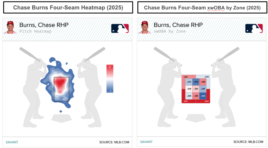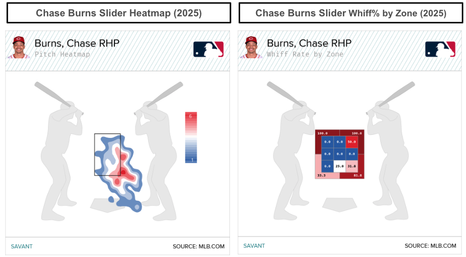 Before suggesting that Burns is another version of Hunter Greene, we would argue that Burns has better control and command than Greene, based on the heatmaps. Among the Reds’ starting pitchers, Burns (106) trailed Nick Martinez (108) in Location+, aligning with the idea of Burns having good command and pitch location.