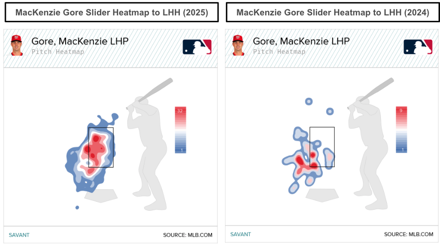 With Gore’s pitch mix change, there has been a slight location change, as he throws more sliders to left-handed hitters. We’ve seen sliders thrown more up in the zone in 2025 than primarily down and away from left-handed hitters in 2024. The visual below shows Gore’s slider heatmaps against lefties in 2024 and 2025.