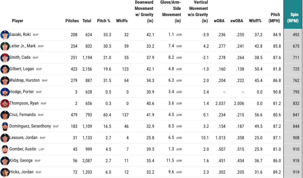 Waldrep’s profile will be volatile, with poor control and a reliance on a splitter as his primary pitch. It’s a unique splitter that comes from his higher arm angle (55.5 degrees), generating over 34 inches of downward movement. Waldrep’s splitter is almost like a knuckleball, with the fifth-lowest spin rate, close to Logan Gilbert‘s splitter (min. 500 total pitches thrown). Gilbert’s splitter is slower and drops nearly eight inches more than Waldrep’s.