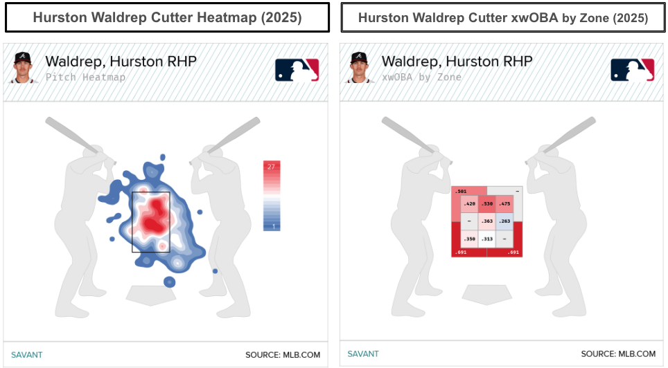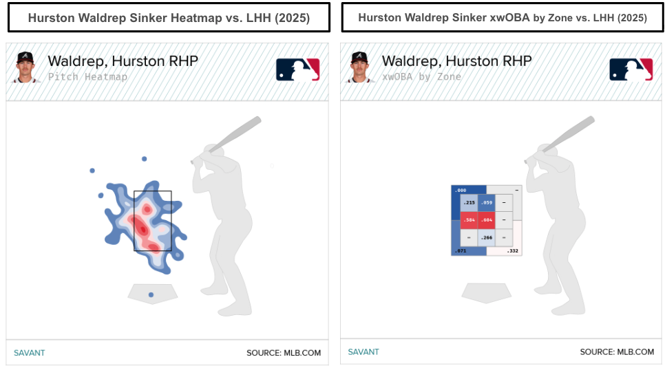 One adjustment for Waldrep’s cutter in 2026 involves throwing it more toward the glove side of the plate, away from right-handers and toward the inside of the plate for left-handed hitters. Though cutters and sinkers don’t typically raise excitement, let’s talk about Waldrep’s sinker. He locates it low and away from left-handed hitters, which can be an optimal approach.