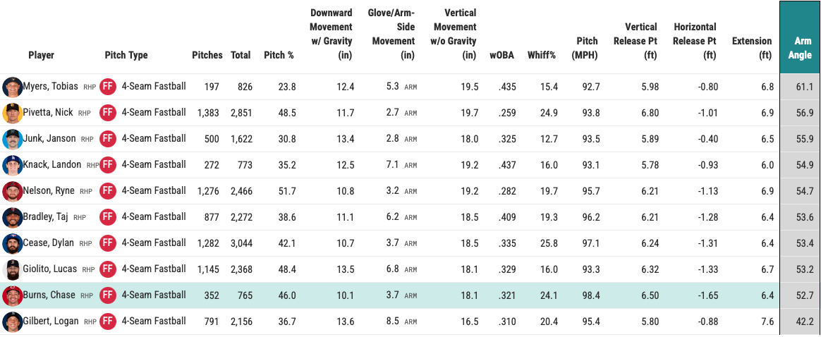 Burns throws from a higher arm angle, over 53 degrees, with over 18 inches of induced vertical break (IVB). For comparison sake, Burns, Lucas Giolito, Dylan Cease, Taj Bradley, Ryne Nelson, Landon Knack, Janson Junk, Nick Pivetta, Justin Verlander, and Tobias Myers throw from a 53-degree arm angle or higher, with over 18 inches of IVB on their four-seamer.