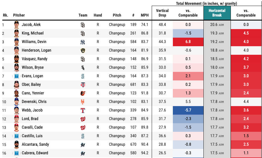 Cavalli’s knuckle curve (17.5 percent) and changeup (20.6 percent) lead his arsenal from a swinging-strike rate standpoint. Though we prefer changeups with more downward movement, Cavalli’s generates a nasty amount of arm-side fade (17.7 inches). Cavalli’s changeup compares closely to Sandy Alcantara‘s based on velocity and its movement profile. Other similar changeup comparisons include Michael King and Edward Cabrera, seen below.