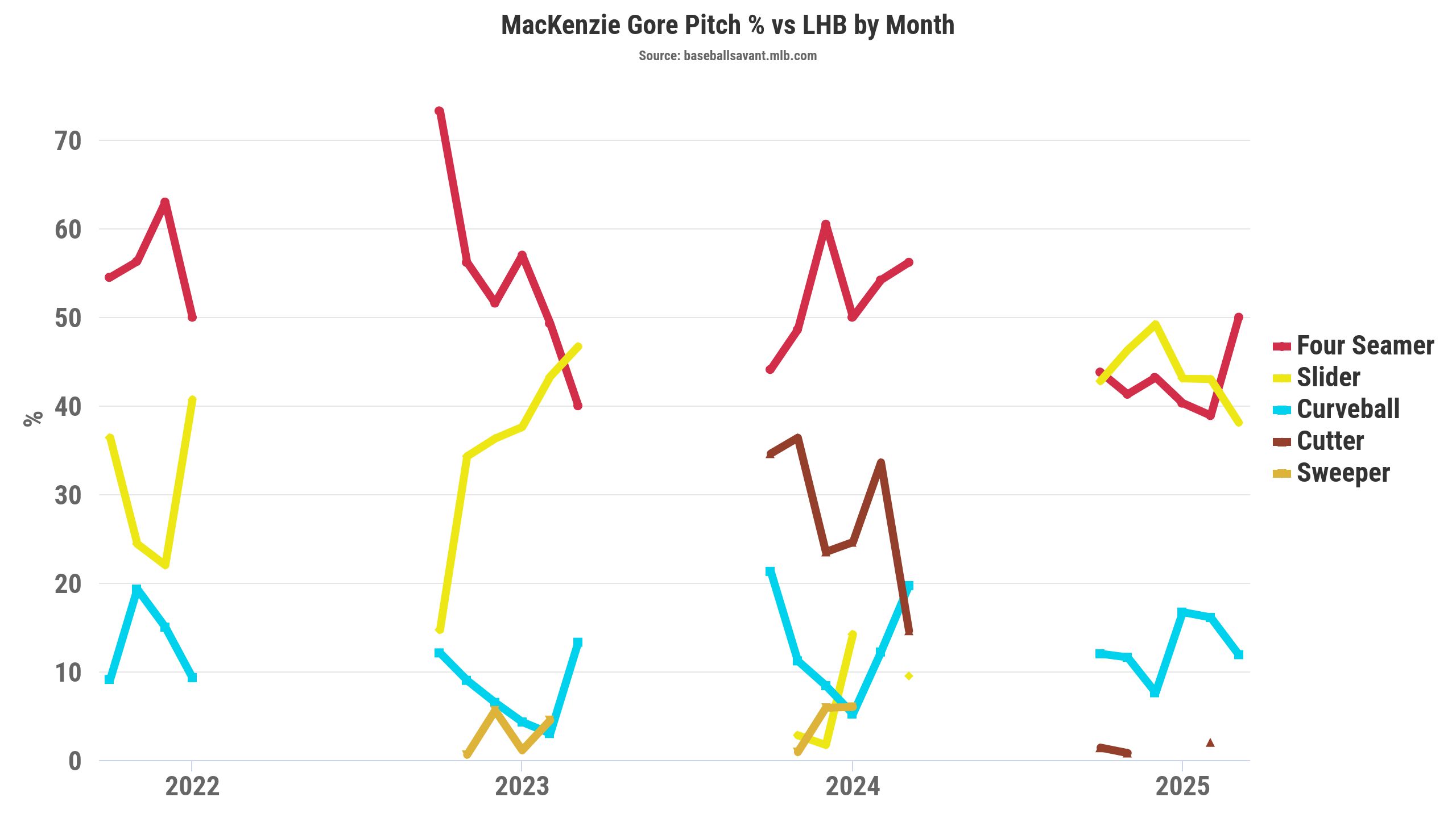 Gore’s cutter usage against right-handed hitters coincided with a massive uptick in sliders against left-handed hitters. For context, Gore threw his slider 44.3 percent of the time (2025), compared to 4.9 percent in 2024 and 33.1 percent in 2023 against left-handed hitters. He lowered the four-seam usage against lefties in 2025 while reducing the cutters thrown, as seen below.