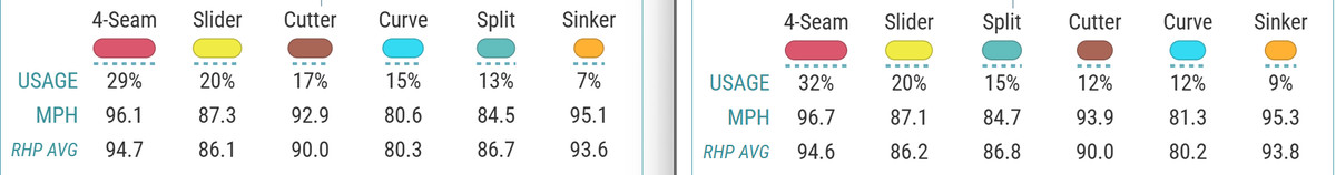 You can see his Whiff% off to the right. Most of his pitches this year are actually getting a higher percentage of whiffs with the exception of the curveball and the splitter. Unfortunately as you can see, those were the pitches he was downright destroying the league with last season, and while they are still getting whiffs this year, a 10-point drop is a lot.