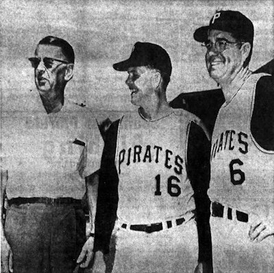 Hall of Fame pitcher Lefty Gomez, left, visits the Pirate training camp and talks with Wood, center, and pitching coach Clyde King. Source: News Press, March 11, 1965.