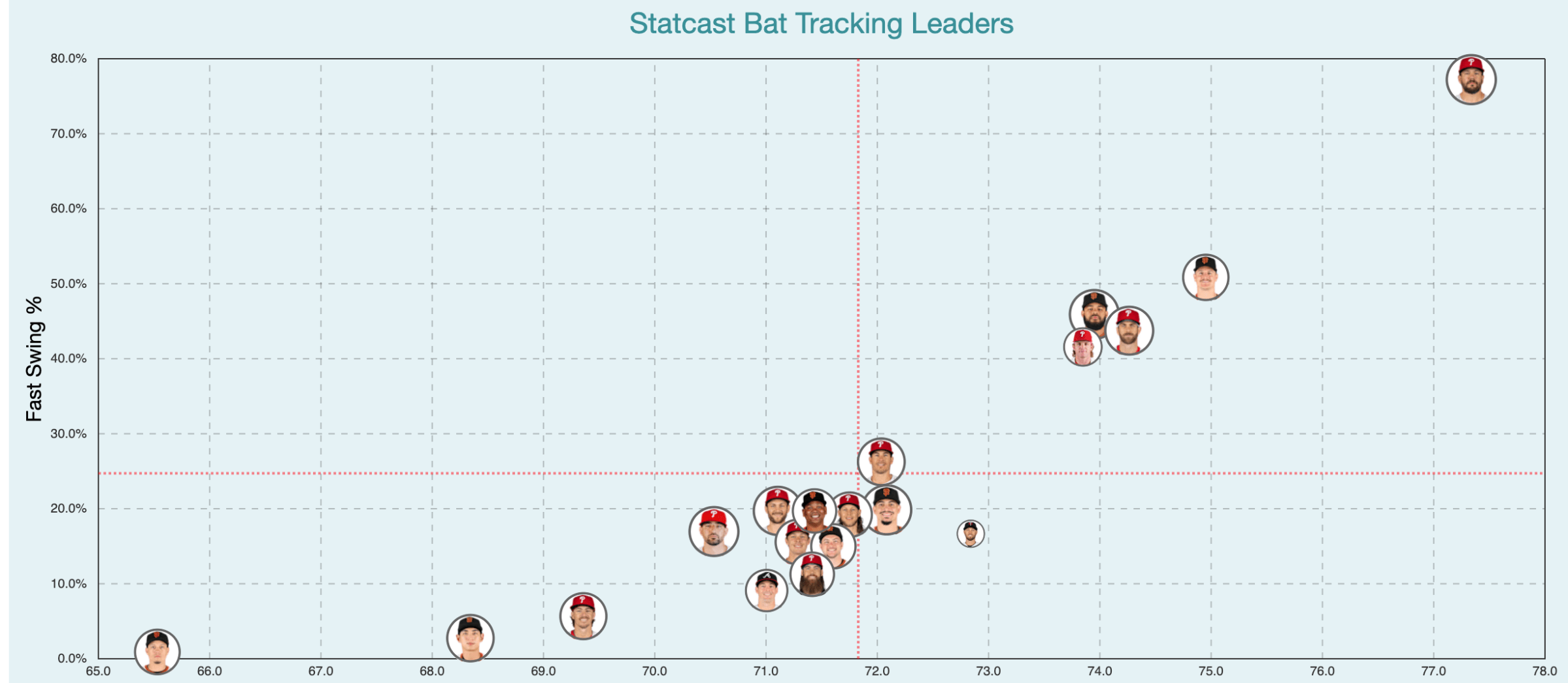 Bader started making those quality cuts at a much higher clip than ever before, going from uncorking a Fast Swing 20% of the time to doing it 37% of the time. Now he didn’t catapult himself into the upper-echelon of bat tracking gods like Kyle Schwarber or Aaron Judge, but those swing improvements did land him among a relatively high-tier. Bader’s 2025 bat tracking metrics would’ve put him comfortably in the top-3 of fast-swingers on the Giants line-up clustered right alongside Heliot Ramos and Matt Chapman.