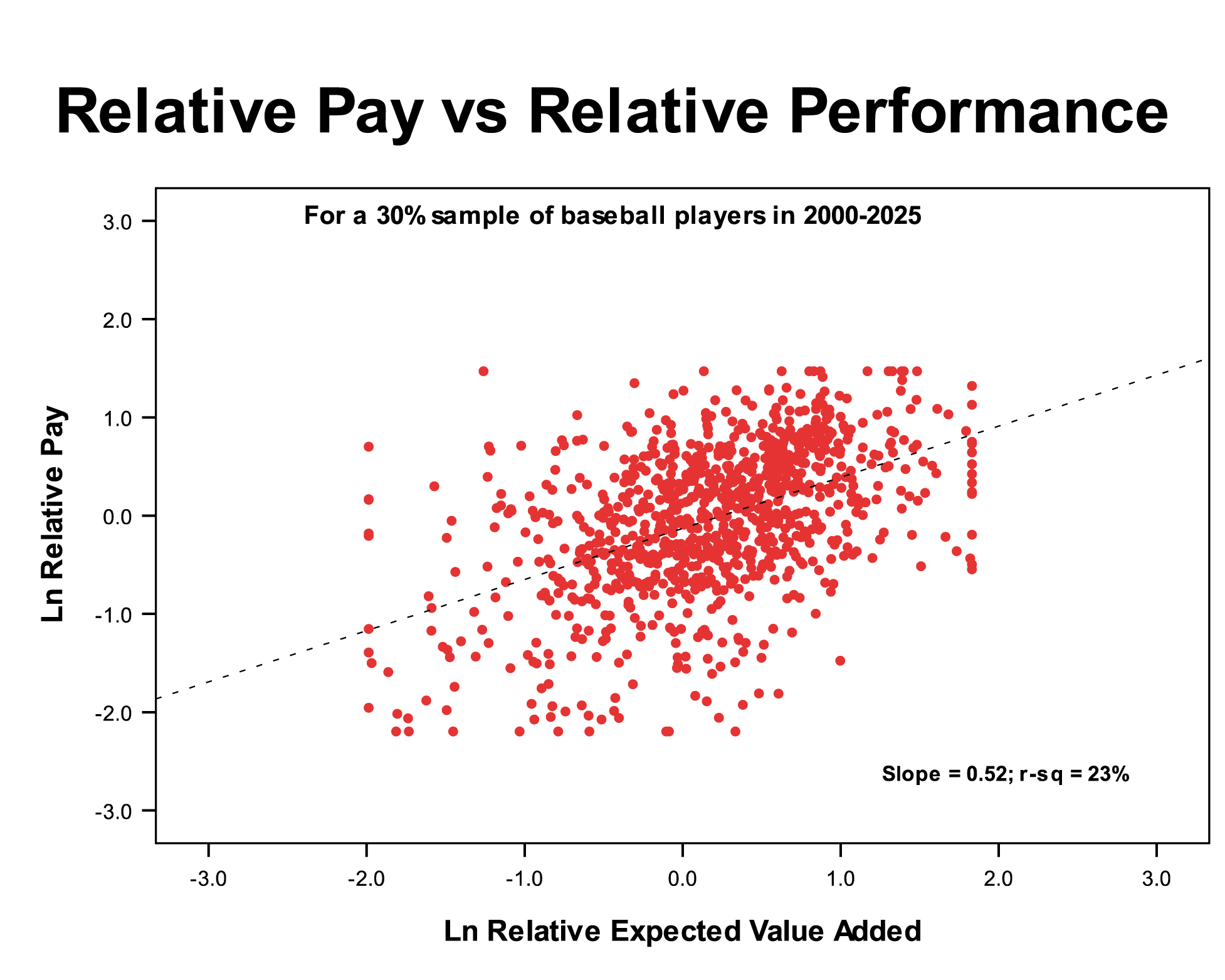 Figure 2 shows log relative pay plotted against log relative expected value added for baseball players. We limit the sample to baseball players with at least five years of consecutive service in the years 2000-2025. We measure relative pay and relative performance on an annual basis. The sample is 3,307 annual observations of relative pay and relative value added for a total of 440 players.[3]