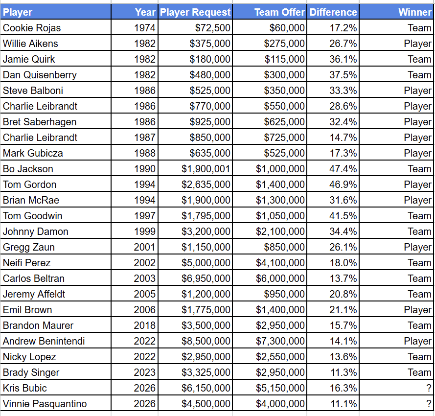 The Royals haven’t gone to an arbitration hearing since 2023, when they won their case over Brady Singer, but they’ve had plenty of experience going head-to-head with players over the years. Since players won the right to go to arbitration in 1973, the Royals have had 23 arbitration hearings so far, winning 12 of their cases, while players have won 11. The table below shows what each side filed for, and how much larger the player request was than the team offer.
