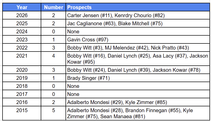 Prospects1500 ranked the Royals #26 at the end of last season, writing that if “Kendry Chourio continues his breakout and Blake Mitchell can bounce back after an injury-filled 2025, the top of this system could look stronger this time next year. Fangraphs has farm system rankings based on Future Value metrics of top prospects in each system, ranking the Royals 28th.