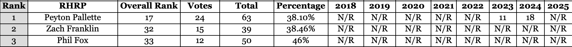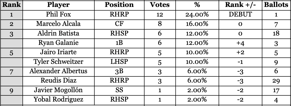 For the second straight and now the fifth time, a player has topped the ballot in his first try (and technically, No. 1 overall voted prospect Braden Montgomery sorta doesn’t count). But this round, Phil Fox has joined Mathias LaCombe, Ky Bush and Zach Franklin as first-timers and Vote winners all in one sweep. Fox earned 12 of 50 (24%) votes: