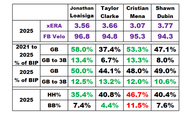 The following table compares the four pitchers. My first focus was on ground ball percentage of balls-in-play (BIPs) and ground balls to third base percentage of BIPs. Next, I considered hard-hit percentages and bases-on-balls percentages. Data from Baseball Savant.