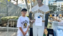 Anthony Aguilar, 12, stands next to a life-sized cut out of Padres Hall of Famer, Dave Winfield. One of the items at the FanFest Garage Sale, Saturday, January 31, 2026.