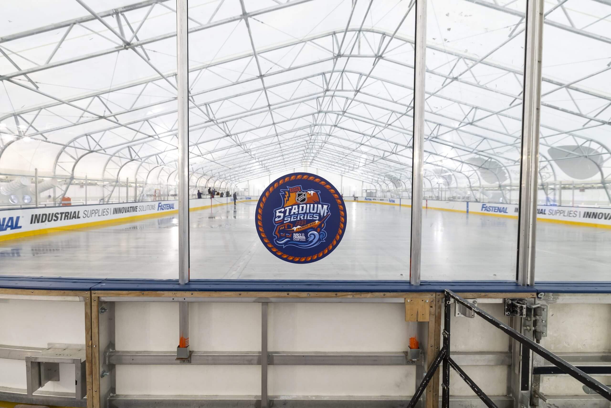 The rink at Raymond James Stadium is currently inside a climate-controlled structure. (Mark LoMoglio / Getty Images)