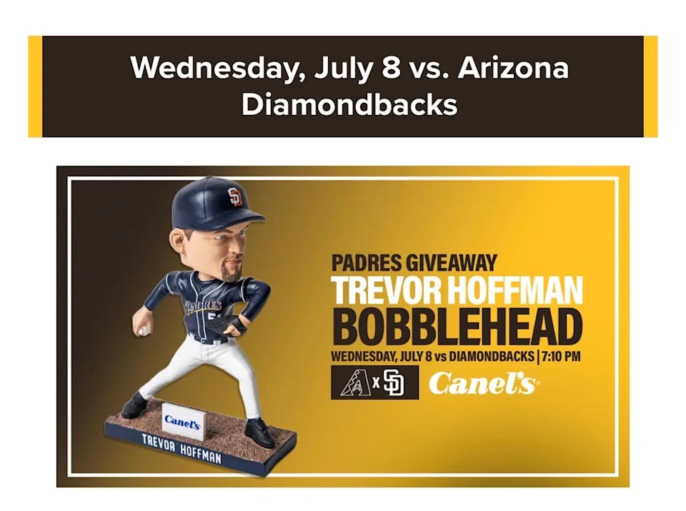 Hoffman started his tenure in San Diego at the end of the 1993 season, and he remained with the Padres through the 2008 season. Hoffman accumulated 552 of his 601 saves in San Diego, which included his career best 53 save season in 1998, helping the Padres reach the World Series. It is fitting the Hoffman bobblehead is donning the navy-blue hat and jersey with white pants that was the uniform during that magical season.