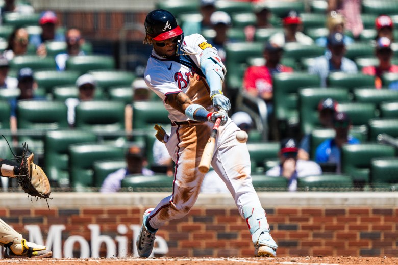 Ronald Acuña Jr. (above) of the Atlanta Braves hits a double in the fifth inning during game one of a doubleheader against the San Diego Padres at Truist Park on May 20, 2024, in Atlanta, Georgia. Photo by Matthew Grimes Jr./Atlanta Braves/Getty Images