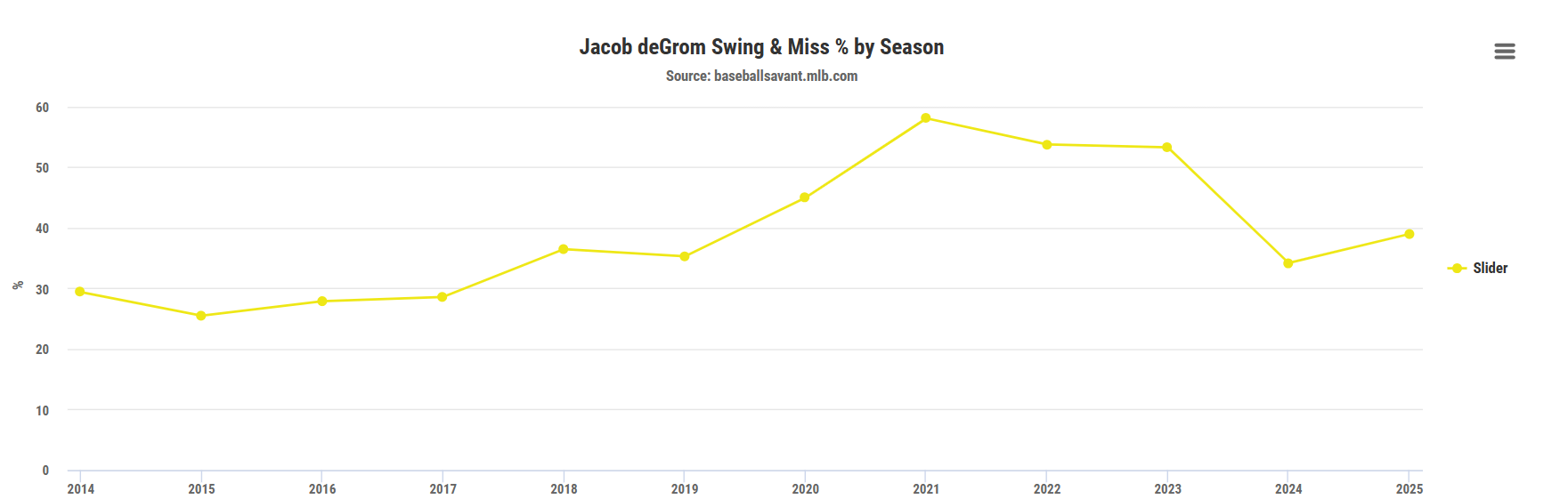After logging just 105 1/3 total innings from 2022 through 2024, Jacob deGrom turned back the clock in 2025, as he tossed 172 2/3 innings. He held a 2.97 ERA with a stellar 0.92 WHIP. He struck out hitters at a high 27.2% rate (83rd percentile) and maintained strong command, allowing walks at a 5.5% rate (89th percentile).