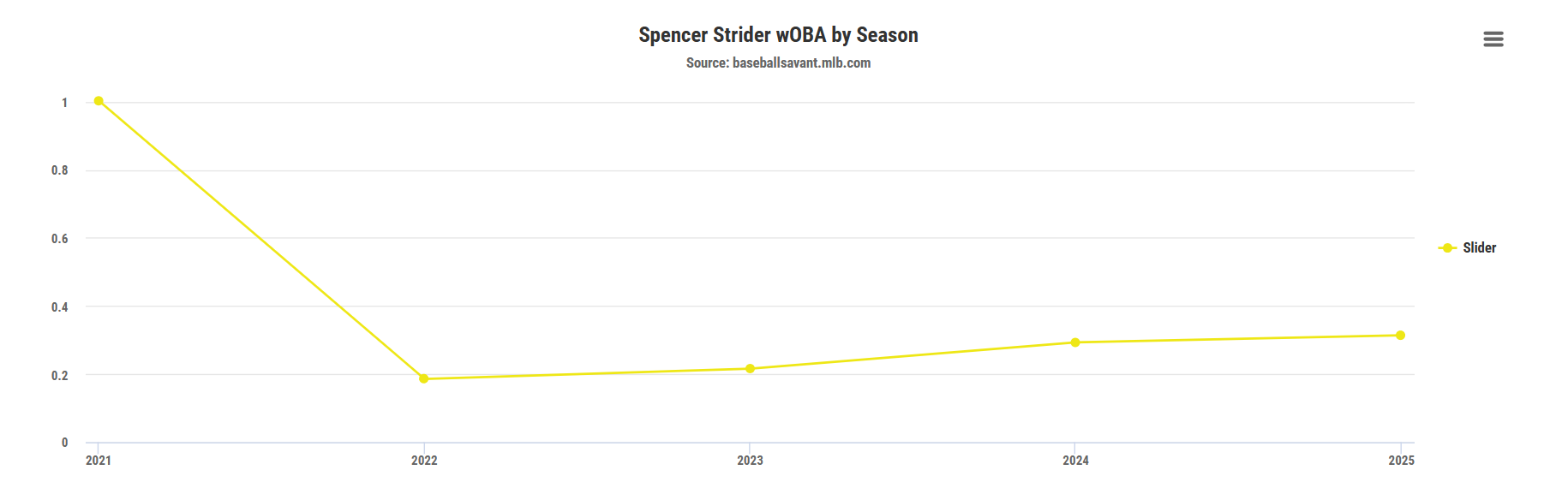 In his prime, Strider was a three-pitch pitcher (four-seamer, slider, changeup) with a high four-seamer and a slider accounting for nearly 90% of his usage. In 2023, his four-seamer boasted a .319 xwOBA while his slider racked up whiffs at an eye-catching 55.7% rate. However, in 2025, his pitches show massive regression,