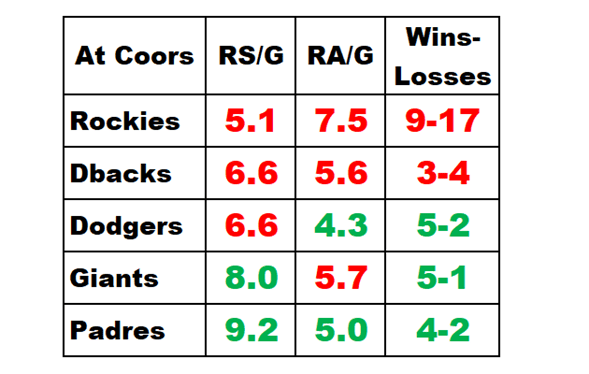 Focusing on the NL West, runs scored and runs allowed can explain why the Diamondbacks had a worse record when playing the Rockies at Coors. The Diamondbacks ranked lowest in runs scored per game, and they ranked highest in runs allowed per game. The following table provides details. Data from Baseball Reference.