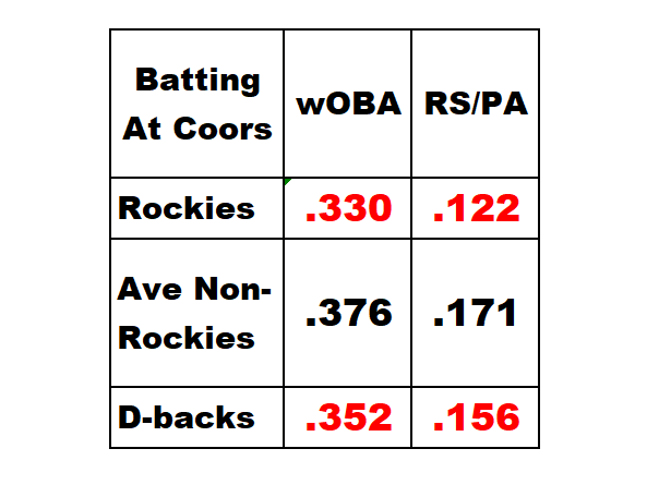 The Diamondback batting shouldered most of the blame for the poor win-loss record at Coors because the batting wOBA was much worse than non-Rockies teams (while pitching wOBA about the same).
