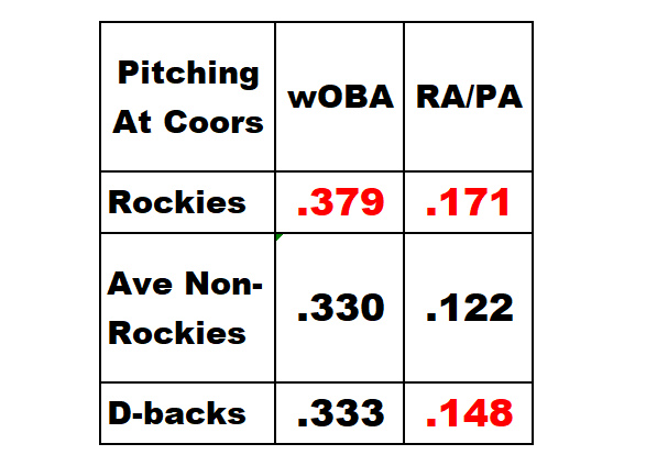 Pitching at Coors. The following table shows two statistics. Although they pitched better than the Rockies at Coors, the Diamondbacks pitchers had better than average wOBA against, but average runs allowed per PA of the other teams at Coors. Data from Baseball Savant.