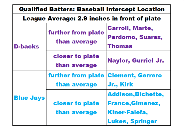 Swing Characteristic. For the entire season, the Blue Jays qualified batters had a swing characteristic that was significantly different than the Diamondbacks. While it is a characteristic of Diamondbacks batters that they intercepted the baseball farther than the average distance in front of the plate (per this AZ Snake Pit article), most Blue Jay batters intercepted the ball nearer than average to the front of the plate. The following table shows the difference between the teams. Data from Baseball Savant.