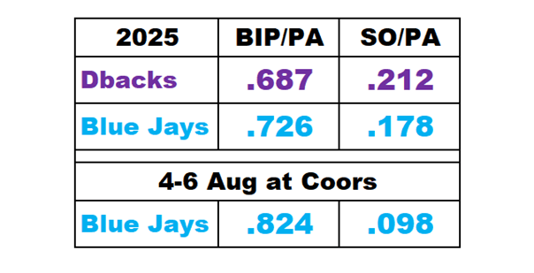 Much of the difference between the teams is that the Blue Jays’ batters intercepted the baseball nearer than average to the front of the plate, while the Diamondbacks batters intercepted the baseball farther than average to the front of the plate. Because of Coors’ high altitude, pitches move less. Therefore, when the Blue Jay batters hit closer to the plate, they did NOT suffer a reduced contact rate that would normally occur in venues at a lower altitude.