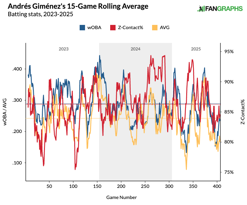 Volume was an issue for Gimenez last season after missing two months due to lower-body injuries (strained quad, strained ankle). The previous two seasons (2023-2024) should provide us with a baseline of double-digit home runs, 25-30 stolen bases, and a .250 batting average.