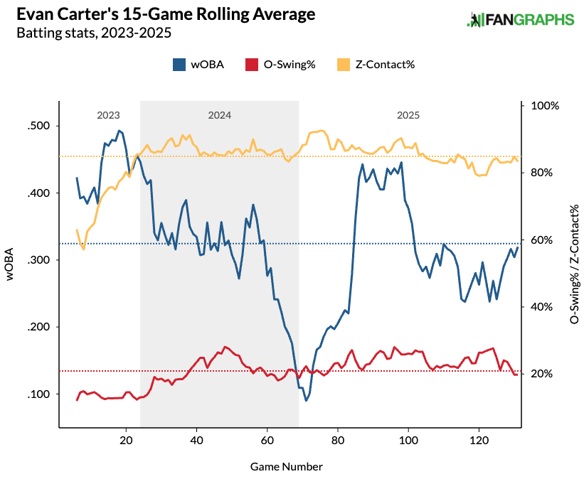Carter possesses strong plate discipline, while using a patient approach, since he chases five to six percentage points less often than the league average. That coincides with Carter’s zone swing and overall swing rates being 3-4 points below the league norm. Carter’s power skills look mediocre, with a 4.1 percent barrel per plate appearance (barrel/PA) in 2025 and a career 94 Expected Power Index (100 is average).