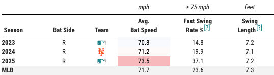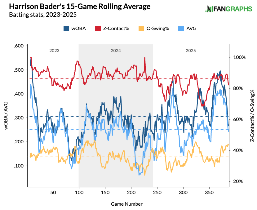 Interestingly, Bader sold out for power because his contact rate (69 percent) fell in 2025 from 76 percent in 2024 and 72 percent across his career. That’s further evident in Bader’s .238 expected batting average (xBA), given a .276 actual batting average, and he might’ve been lucky in that category.