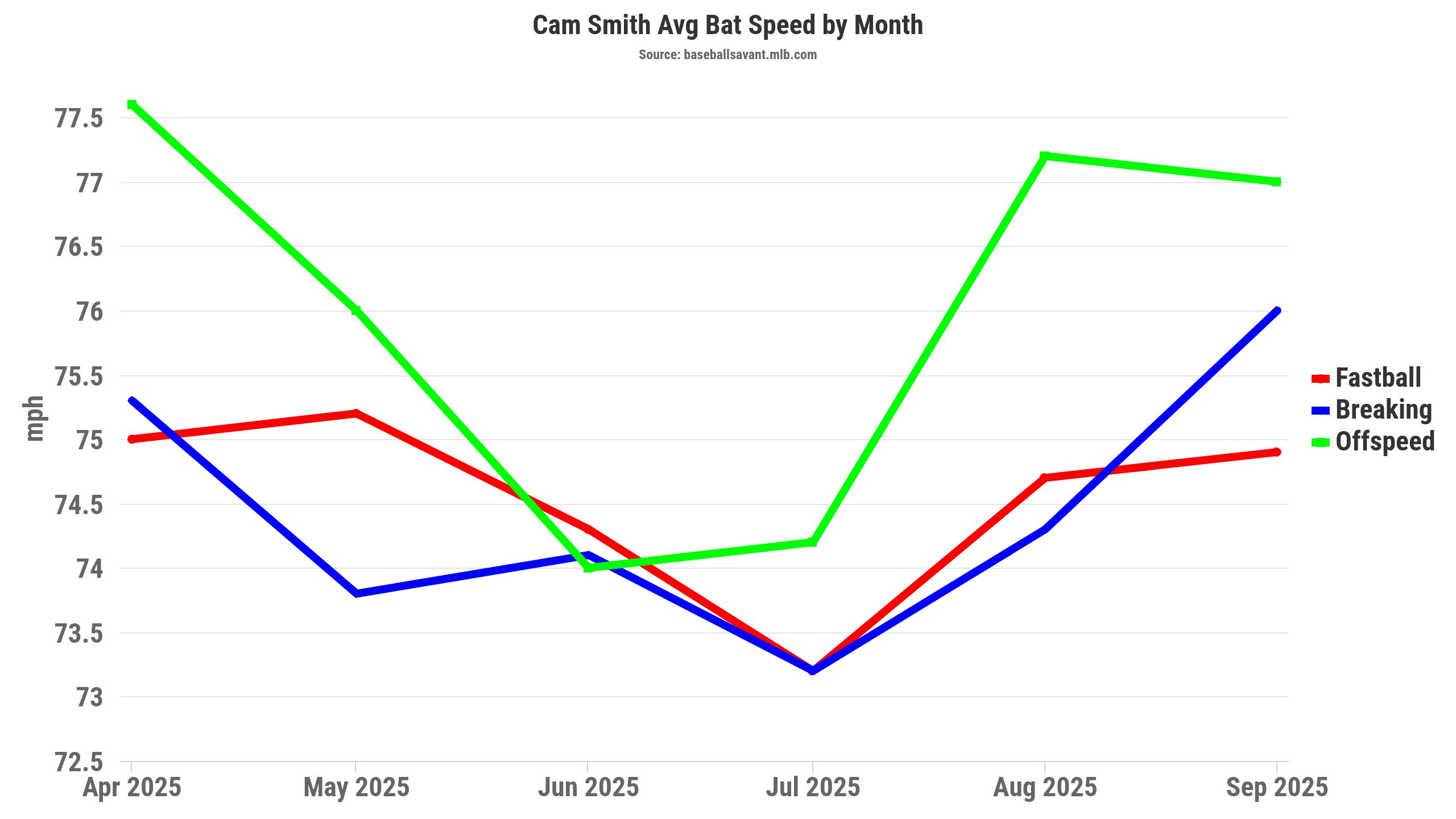 For context, Smith had plus-graded raw power as a prospect, teasing us at the potential for 25 home runs over a full season. That’s somewhat evident in Smith’s high-end bat speed (74.5 mph) and fast swing rate (46.9 percent). The league average bat speed hovers around 72 mph, with Smith’s fast swing rate being nearly double the norm (23.6 percent). Smith especially finished the season with strong bat speed.