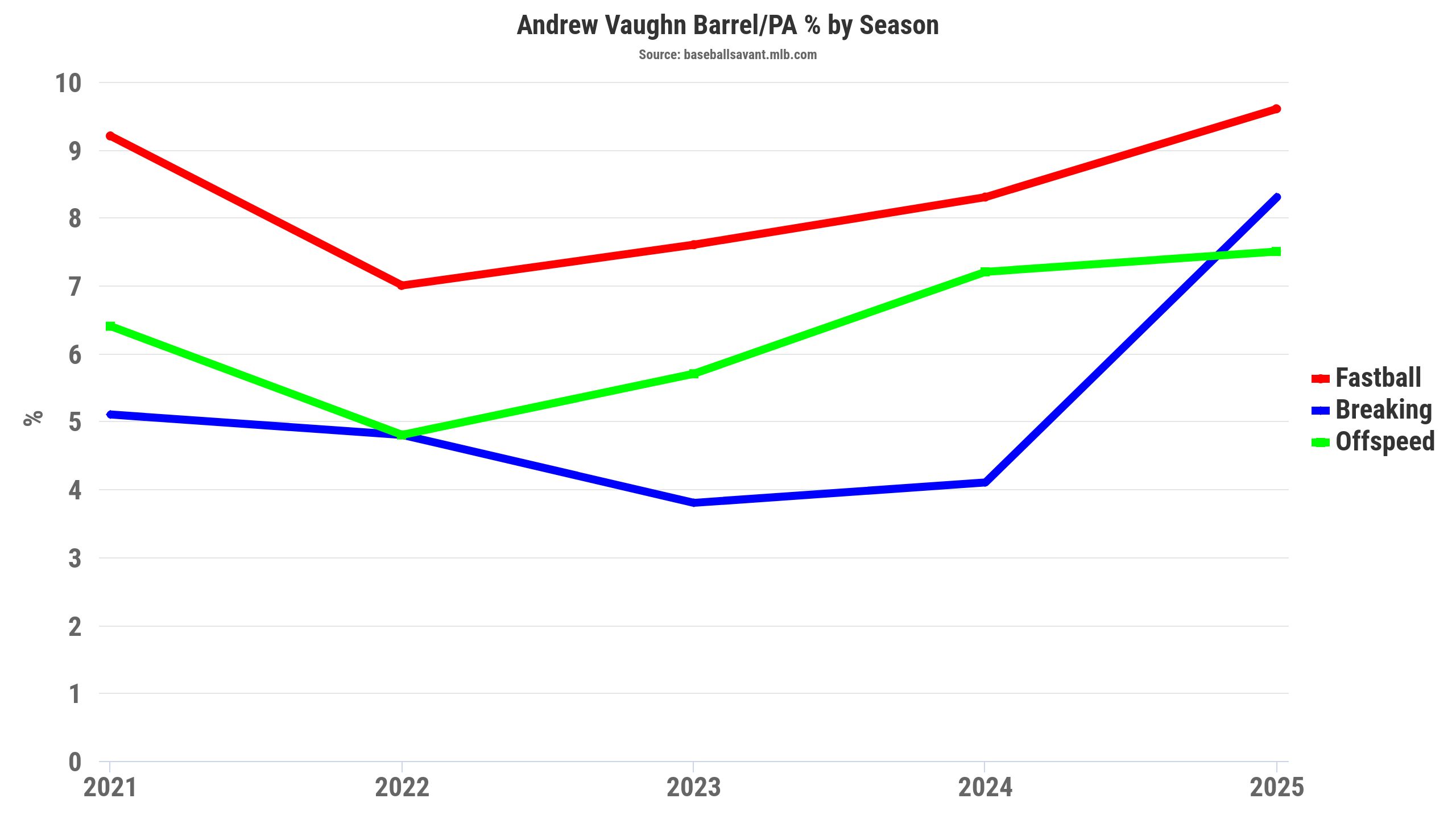 The skills supported the better production, with an 83 percent contact rate and .277 xBA with the Brewers. Vaughn’s power skills hinted at better outcomes, with a career-best 8.9 percent barrel rate (barrels per PA) in 2025. That type of power should play well in the Brewers’ home park for a full season, ranking 6th in home run park factors for right-handed hitters (110). That’s significantly better than the White Sox home park, ranking 18th (96) in home run park factors for righties.