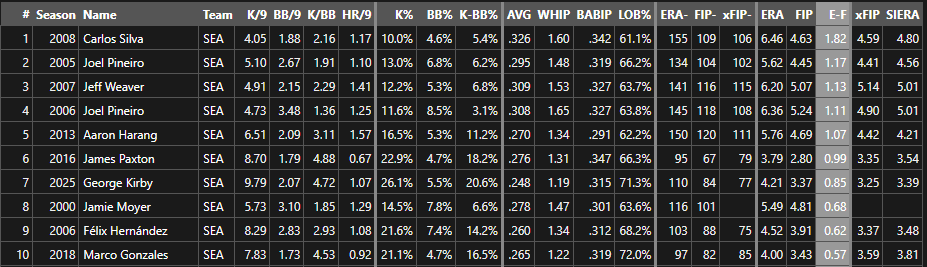 To have things go this poorly requires some ill fortune, as Dylan Cease and Sonny Gray can attest. But to have this occur with Seattle as your home park is difficult to reconcile. Kirby’s 0.85 gap between his earnie and his fippie (don’t love that) is the worst in a decade for a Seattle starter at this workload. Marco Gonzales ran a 0.57 gap in 2018, 15th in MLB, the last time a Mariner entered this range of ill fortune despite the contact-suppressing confines of T-Mobile Park at their backs. It requires a retreat to 2016 James Paxton to find a Seattle pitcher more maligned than Kirby, whose 0.99 ERA-FIP presaged a stretch of several brilliant seasons for the Big Maple. In T-Mobile Park history, only the most contact-managing, cartoonishly unfortunate have outpaced Kirby’s bitter, season-long pill.