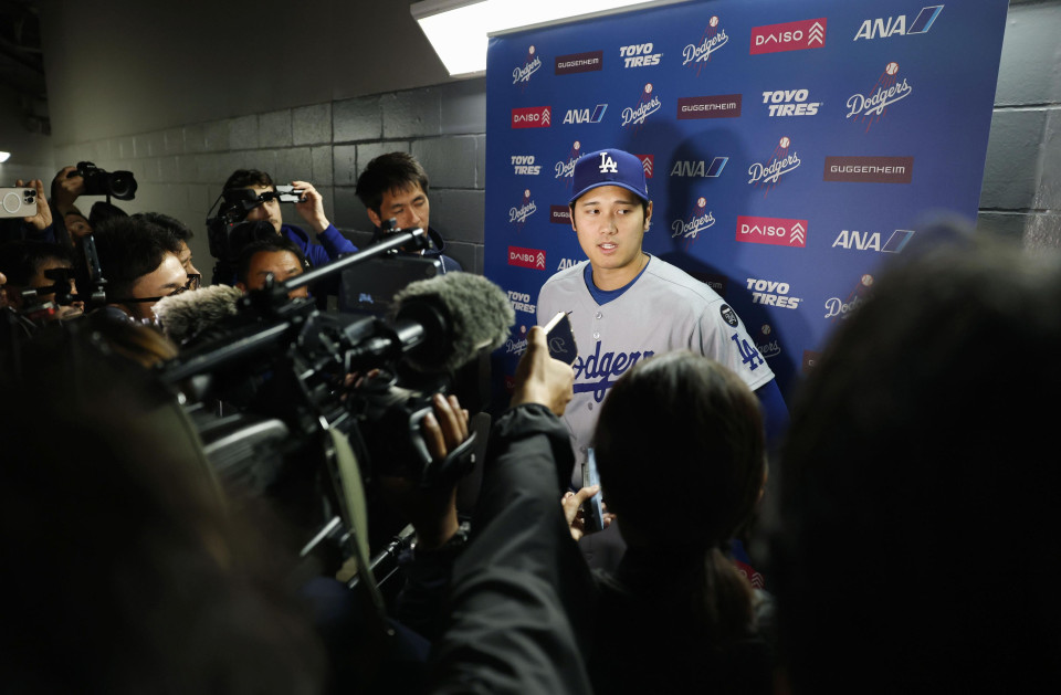 Los Angeles Dodgers designated hitter Shohei Ohtani speaks to reporters at Citi Field in New York after a baseball game against the New York Mets on May 25, 2025. (Kyodo)