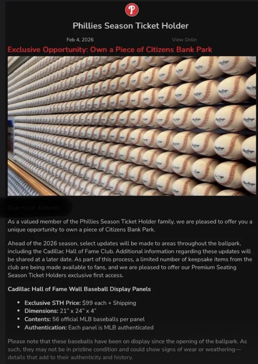 The Phillies sent out an email to season-ticket holders Wednesday offering them the chance to buy a baseball display panel from the Cadillac Hall of Fame club:Â