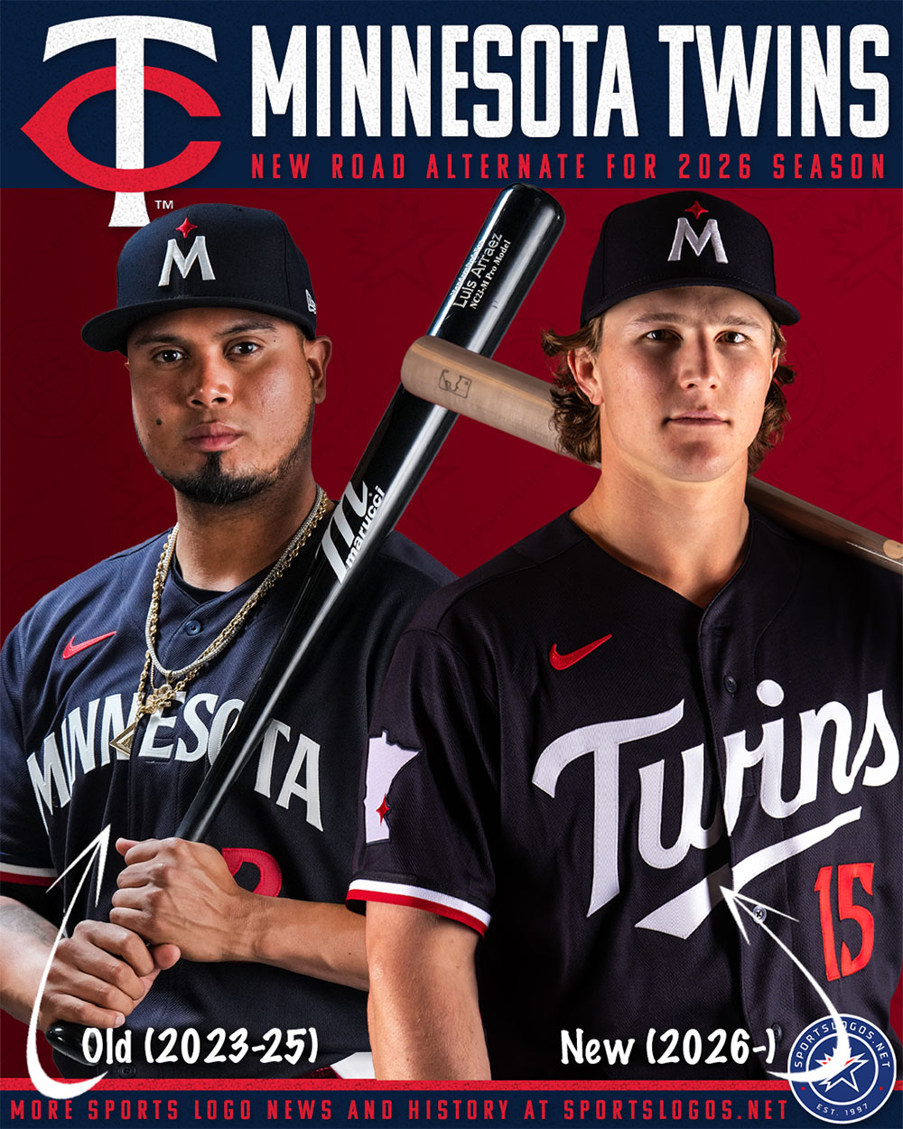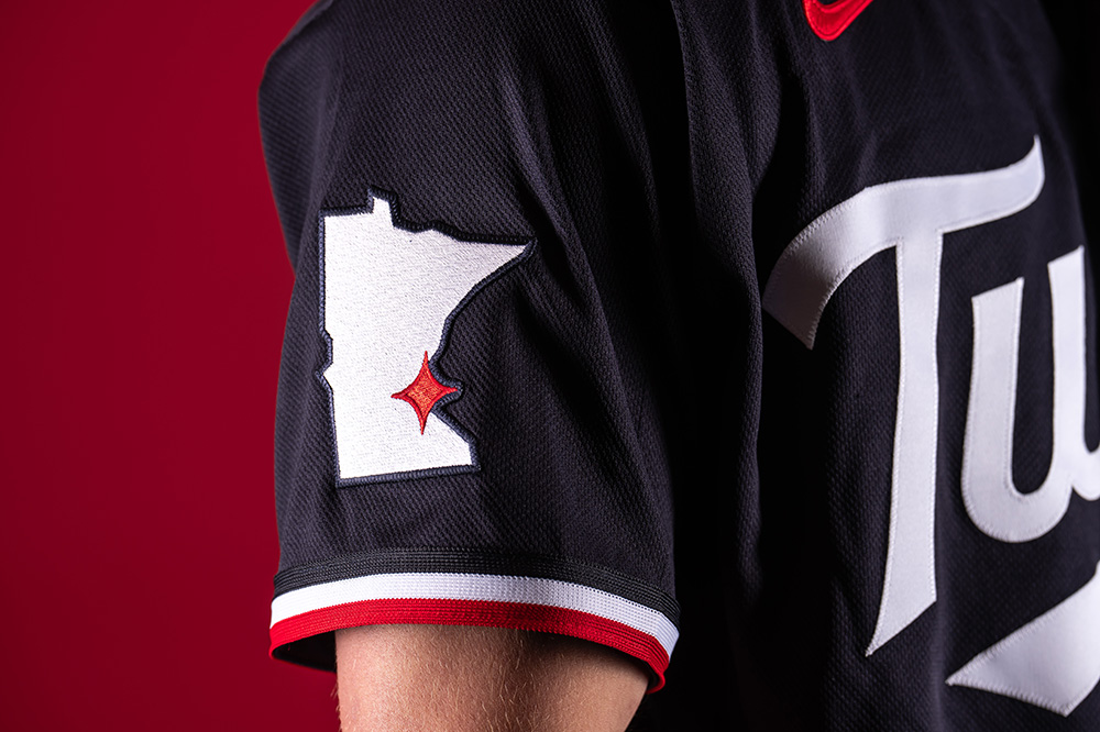 While the base colour and cap remain the same, the wordmark across the front is changing from the white arched “MINNESOTA” logo to a white scripted “Twins”. The player number below stays red, and the sleeve striping also stays blue/white/red. On the sleeve, the patch changes from the Twins “TC” logo to a state map of Minnesota with their red North Star graphic placed on the Twin Cities. Here’s a side-by-side: