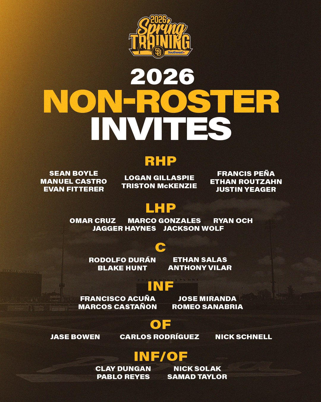 The organization recently announced 28 players invited to Spring Training who are not on the roster. Those players (NRI’s) include 13 players who were recently added to the organization. There are 13 pitchers, four catchers, seven infielders and four outfielders in the group. It includes the Padres No. 1 prospect Ethan Salas who missed most of the 2025 season due to a stress fracture in his lower back. Following is the full list of NRI: