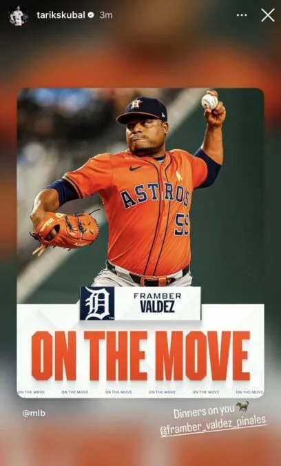 Shortly after news broke that the Tigers had agreed to a record-setting contract with left-hander Framber Valdez, Skubal shared a simple but telling Instagram story. The post featured Valdez in his Astros uniform with the words “Dinners on You @Framber_Valdez_Pinales” below the graphic, a clear nod that Skubal was fully tuned in and fully on board.