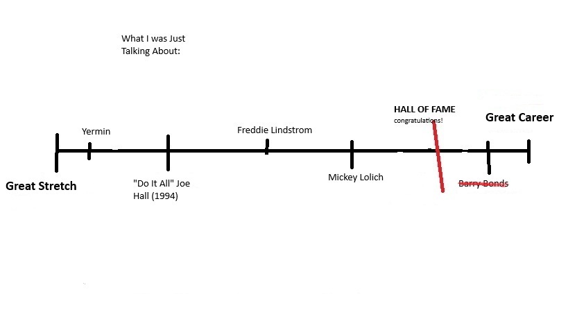 I think of the Big Hall-Small Hall debate as a spectrum. One end says “Great Career” and the other says “Great Stretch.” At the Career end are the Babe Ruths, Tom Seavers and Jackie Robinsons who put up MVP-caliber numbers for 10-plus years. The other extreme is for the flash-in-the-pan types like Yermín Mercedes or Joe Hall (ifyky.) In the middle of that spectrum is everyone else.