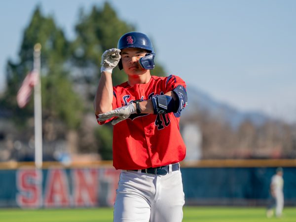 Sophomore designated hitter Aiden Sakai celebrates after making it safely to first in the game against Cañada College on Friday, Feb. 6 at home. (Yna Bollock)