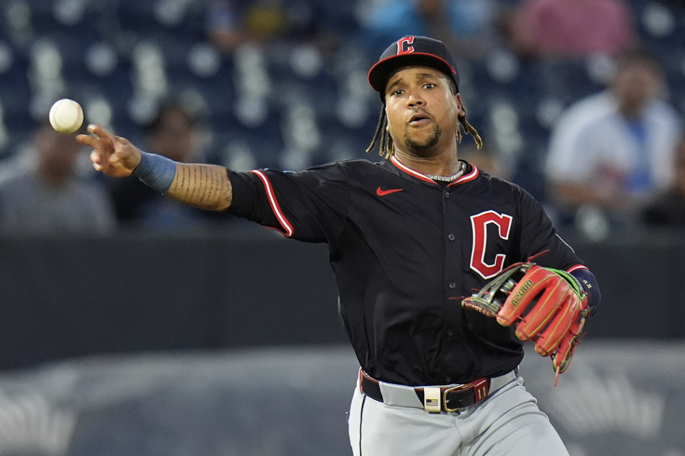 Cleveland Guardians third base José Ramírez throws out Tampa Bay Rays’ Yandy Díaz at first during the first inning of a baseball game Thursday, Sept. 4, 2025, in Tampa, Fla. (AP Photo/Chris O’Meara)