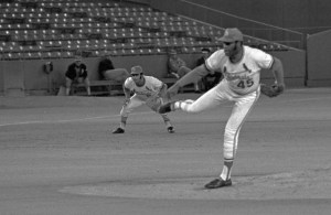 He took the photo of Bob Gibson at a game in the 1970’s. That’s Joe Torre at third base.